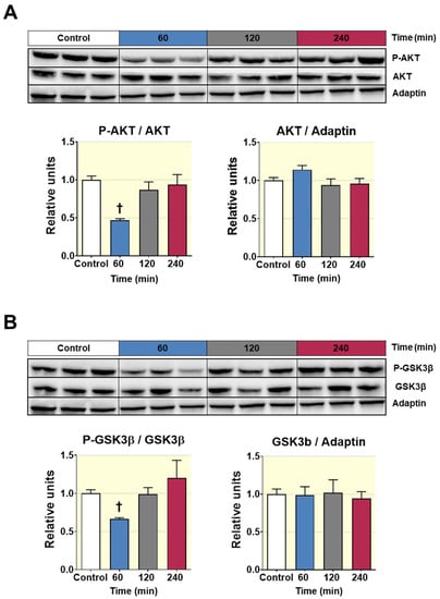 Western blot analysis of the phosphorylation status of the enzymes AKT and GSK3β from liver lysates of Wistar rats treated with 500 mg/Kg of D-Pinitol (p.o.), for 60, 120 and 240 min. (A) Representative western blot analysis for AKT (upper panels) and p-AKT/AKT ratio and AKT/adaptin ratio (bottom panels), from liver samples of Wistar rats treated with D-Pinitol for times indicated in figure. The blot shows analysis from three independent samples from each treatment group. The corresponding expression of adaptin is shown as a loading control per lane. (B) Representative western blot analysis for GSK3β (upper panels) and p-GSK3β/GSK3β ratio and GSK3β/adaptin ratio (bottom panels) of liver samples from Wistar rats treated with D-Pinitol, at times indicated in figure. The blot shows analysis from three independent samples from each treatment group. The corresponding expression of adaptin is shown as a loading control per lane. All samples shown in the figure were derived at the same time and processed in parallel in the corresponding blot. The adjustment to digital images did not alter the information contained therein. Differences between groups were evaluated using one-way Anova + Fisher’s LSD test: † p < 0.01 vs. Control group.