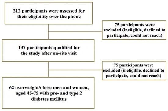 From the analysis of the two studies, a total of 212 participants were screened over the telephone and 137 of those participants were screened onsite for this cross-sectional study. Seventy-five participants who qualified were dropped from the study due to the inability to obtain three-day food records (n = 20), failure to contact (n = 38), and personal reasons (n = 17). Sixty-two participants (n = 40 females and n = 22 males) who met the inclusion criteria were included in the study. Clinical, laboratory, and statistical analyses were performed for the 62 participants who completed the screening and study visits. A flowchart of the study enrolment is presented in Figure 1.
