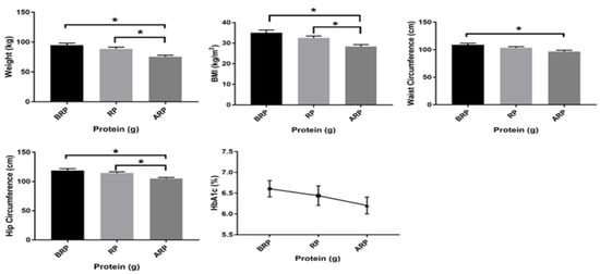 Among group differences in weight, body mass index (BMI), waist circumference, hip circumference, and hemoglobin A1c (HbA1c) of study participants below (n = 17), meeting (n = 22), and above (n = 23) the recommended-protein groups (below the recommended-protein group (BRP), the recommended-protein group (RP), and the above recommended-protein group (ARP), respectively). Values are reported as mean ± standard error of the mean (SEM). * Denotes significant differences among groups (p ≤ 0.05).