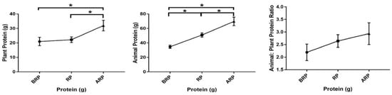 Among group differences in plant protein, animal protein, and animal-to-plant protein ratio intake from the three-day food record averages of study participants below (n = 17), meeting (n = 22), and above (n = 23) the recommended-protein groups (below recommended-protein group (BRP), recommended-protein group (RP), and above recommended-protein group (ARP), respectively). Values are reported as mean ± standard error of the mean (SEM). * Denotes significant differences among groups (p ≤ 0.05).