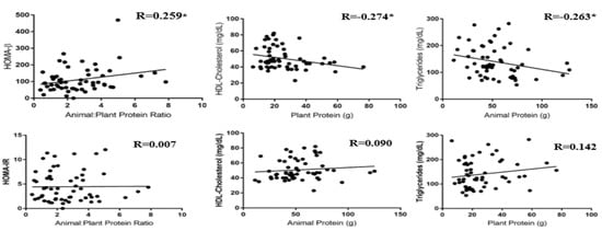 Correlations between homeostatic model assessment for insulin resistance (HOMA-IR) and homeostatic model assessment for beta-cell function (HOMA-β) with animal-to-plant protein ratio; HDL (high-density lipoprotein) cholesterol with animal and plant protein; triglycerides with animal and plant protein (n = 62). Values are reported as Pearson correlation coefficient (r). * Denotes significant differences among groups (p ≤ 0.05).