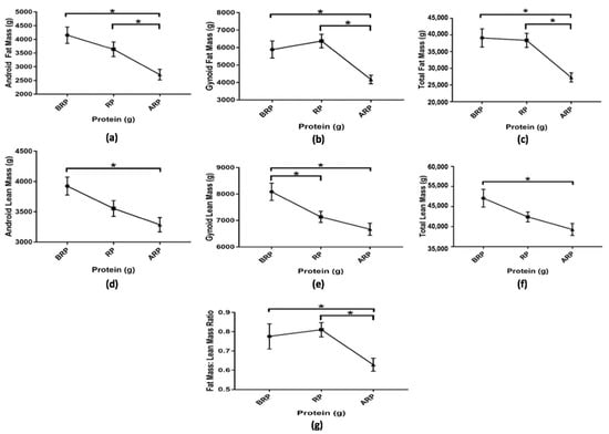 Among group differences in android fat mass (a), gynoid fat mass (b), total fat mass (c), android lean mass (d), gynoid lean mass (e), total lean mass (f), and fat mass: lean mass ratio (g) of study participants below (n = 17), meeting (n = 22), and above (n = 23) the recommended-protein groups (below recommended-protein group (BRP), recommended-protein group (RP), and above recommended-protein group (ARP), respectively). Values are reported as mean ± SEM. * Denotes significant differences among groups (p ≤ 0.05).