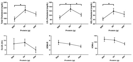 Among group differences in total cholesterol, low-density lipoprotein (LDL) cholesterol, high-density lipoprotein (HDL) cholesterol, oxidized LDL (Ox-LDL), homeostatic model assessment for insulin resistance (HOMA-IR), and homeostatic model assessment for beta-cell function (HOMA-β) of study participants below (n = 17), meeting (n = 22), and above (n = 23) the recommended-protein groups (BRP, RP, and ARP, respectively). Values are reported as mean ± standard error of the mean (SEM). * Denotes significant differences among groups (p < 0.05).