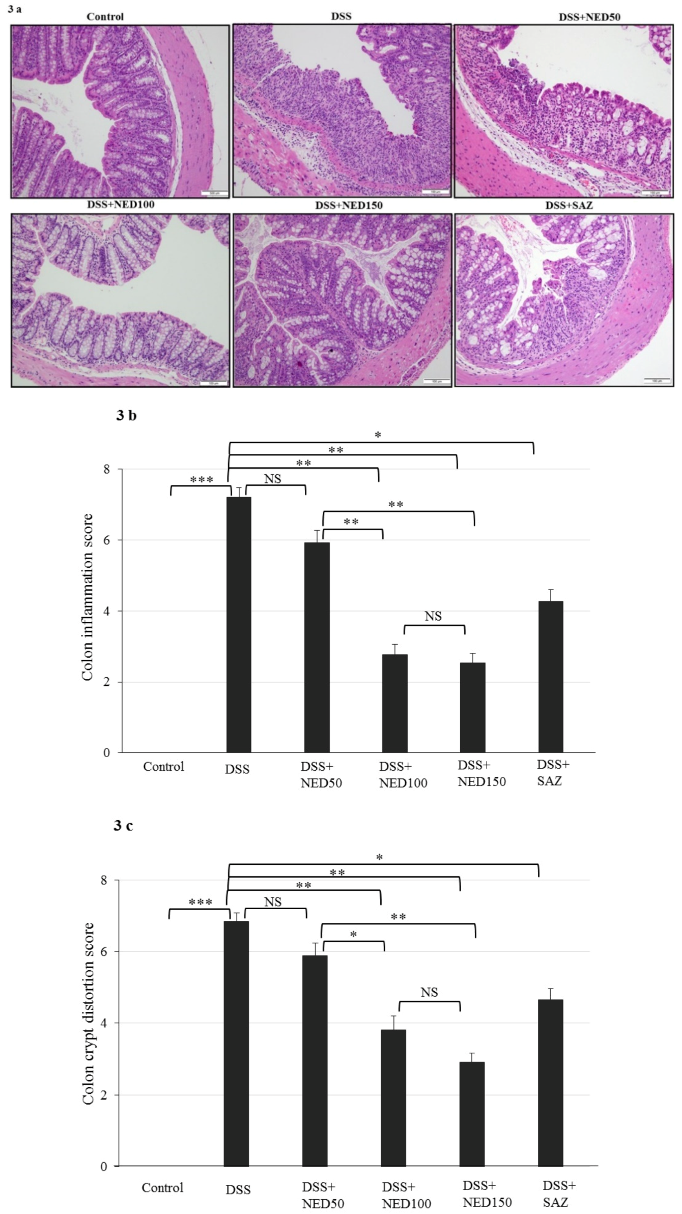 3.3. Effect of NED on Proinflammatory Cytokines and Proinflammatory Mediators