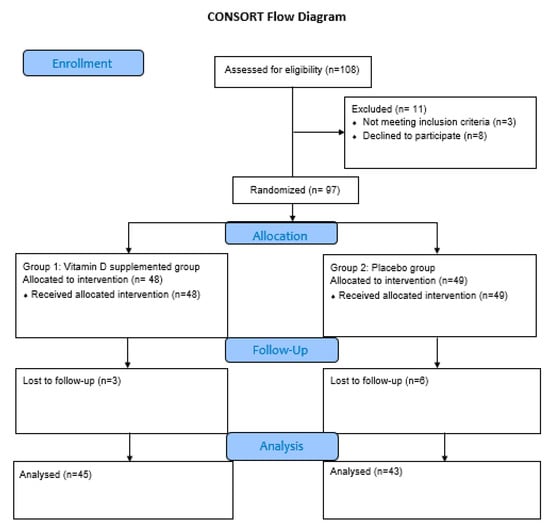 As shown in Figure 1, out of 108 recruited subjects, 11 were not included. The remaining 97 participants were randomly assigned into two groups—a treatment group receiving vitamin D supplements and a control group receiving a placebo pill. In total, 88 participants (45 men and 43 women) remained at the end of the study after those who lost at the follow-up (n = 9). The first visit was in July 2018. The subjects were asked about their exercise habits, the use of sun protection, and the duration of sun exposure during their daily life activities. Moreover, a short food frequency questionnaire was administered to assess their dietary vitamin D intake. Additionally, a written informed consent of the study, approved by the Ethics Committee of the institutional review board of Saint Charles hospital, was given to each subject. The protocols of this trial were prepared, based on the Declaration of Helsinki ethical principles for medical research involving human subjects.