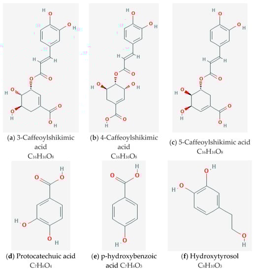 OPP contains numerous water-soluble phenolic compounds such as caffeoylshikimic acid (CFA) as the main component and other phenolic acids including caffeic acid, protocatechuic acid (PCA), as well as p-hydroxybenzoic acid (PHBA) and hydroxytyrosol (HT) []. Their chemical structures are depicted in Figure 1. These natural hydrophilic phenols are associated with antioxidant capacity that can suppress reactive oxygen species (ROS) and potentially curb the development of pathogenic mechanisms related to CVD []. Besides that, OPP has been proposed in preventing and treating CVD via several mechanisms including modulation of biochemistry and metabolism pathways []. In addition, the effects of OPP as a cardioprotective agent have been also associated with its potential anti-inflammatory property [].