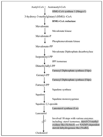 Cholesterol plays an important function in our body as building blocks of plasma membranes and serves as a basis for the formation of bile acid and steroid hormone. Generally, all cholesterols in the human body come from two distinct sources, which are; (i) de novo biosynthesis from acetyl-CoA by the multi-enzyme pathway or (ii) certain types of food ingestion via extracellular transport by low LDL-mediated endocytosis [,]. Cholesterol biosynthesis is a complex process that requires numerous enzymes and has several regulation points throughout the process. Several intermediaries involved in the biosynthesis process can be diverted and utilized as precursors for the biosynthesis of other compounds or perform specific functions in the body []. Leow et al. (2011) revealed that the downregulation of cholesterol biosynthesis genes by OPP in BALB/c mice might exert a hypocholesterolemic effect []. In their study, OPP supplemented as a beverage to the mice had downregulated genes including Hmgcs1, Lss, Sc4mol, Fdps, Nsdhl. Additionally, the OPP supplementation showed negative fold change in the expression of HMGCR gene, a statin-targeted gene responsible for lowering cholesterol level []. The localization of cholesterol biosynthesis genes is shown in Figure 2. Previous study has reported decreased mRNA levels of fdps and HMGR in the mouse liver fed with PUFA-rich tuna fish oil []. It is well known that fish oils can exert cholesterol lowering effects in rodents [,]. Other than that, an in vitro study using short chain fatty acids (SCFA) on human enterocyte cell lines showed downregulation of nine cholesterol biosynthesis genes including sc4mol and fdps genes, which possibly curb the pathway [].