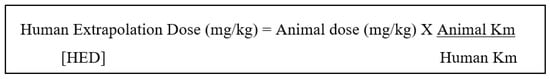 Sambanthamurthi and colleagues performed a teratological study by monitoring three generations of Sprague Dawley rats supplemented with 1500 or 2400 mg/L GAE OPP as the only drinking fluid for 21–22 days (vaginal plug identification until the exact delivery day). For both doses of OPP, the offspring of rats showed the absence of developmental birth defects or congenital anomalies. Moreover, the OPP supplementation to the rats did not affect their well-being. The macroscopic observation on all major organs showed no signs of OPP-induced toxicity []. Several indications from the studied animals also revealed that OPP supplementation up to 3000 mg GAE/L dosage was safe, as shown by the histology, hematology and clinical biochemistry aspects [,,]. Extrapolating animal dosage to humans for phase I and phase II clinical trials should be performed by appropriate conversion of drug doses such as body surface area (BSA) normalization method, as shown below (Figure 3) [].