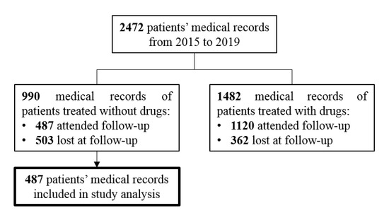 In this retrospective study, we focused our formal analysis on 487 patients treated only with lifestyle modifications coming back at the follow-up visit. The flow chart in Figure 1 reports the allocation criteria and grouping for patients’ analysis as previously described.