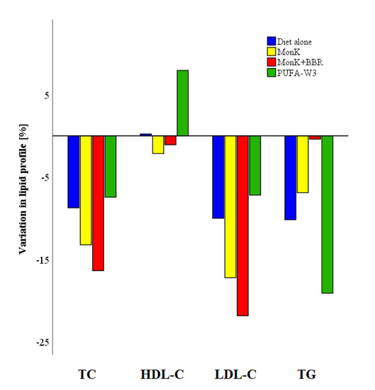 Subjects who received NUTs have been characterized by a greater reduction of lipid parameters than from diet alone. In particular, the LDL-C and TC reduction with MonK was −14.7% and −11.3%, respectively, while other studies reported a percentage variation ranging from −27.3% to −12.5% and from −15.5% to −6.6% in LDL-C and TC, respectively [42,43,44,45,46,47]. Noteworthy, the combination of MonK and BBR was the most effective NUT in reducing LDL-C and TC (−23.4% and −17.4%, respectively). This finding is consistent with literature [24,48] and could be useful in patients with low ASCVD risk, even if the guidelines for the management of dyslipidemias highlighted the lack of high-quality randomized clinical trials. Furthermore, this type of NUTs as an addition to the diet could have various beneficial effects on the risk of atherosclerosis not only related to LDL-C reduction, as previously documented in some publications by other groups and ours [49,50]. On the other hand, the diet supplemented with PUFA-W3 was the most effective TG lowering treatment with a median percentage reduction of −22.6% from baseline to follow-up. This outcome agreed with a recent metanalysis which showed the efficacy of 3 g/day of PUFA-W3 in reducing TG of about 14% [51].