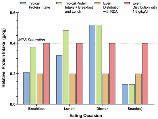 In line with these findings, Hone et al. recommended that older adults increase the frequency of meals meeting the MPS saturation threshold before focusing on protein distribution [69]. One potential strategy is a protein distribution score (PDS), which has been employed in rugby players [93]. The PDS tallies the number of daily eating occasions containing protein above a relative threshold (i.e., 0.4 g/kg for older adults), to shed light on how many meals contained enough protein to maximize MPS. Overall, older adults’ protein intake at breakfast- and lunch-time meals is often insufficient to optimally stimulate feeding-induced MPS, and further research is needed to determine the efficacy of an even protein distribution. A recent review by Hudson et al. corroborated the rationale to adopt an evenly distributed protein intake in support of muscle mass and functional adaptations [94], however, in practice, redistributing protein from the evening meal to breakfast- and lunch-time in a diet that is insufficient in total daily protein intake is ill-advised and should only be recommended to those already consuming adequate daily protein [94]. Since a sufficient bolus of protein is required to maximize MPS, older adults should prioritize the consumption of ≥0.4 g/kg/meal—hence 1.2–1.6 g/kg/day with 3–4 feeding occasions—to increase the frequency of feeding-induced MPS saturation in support of skeletal muscle-related outcomes.