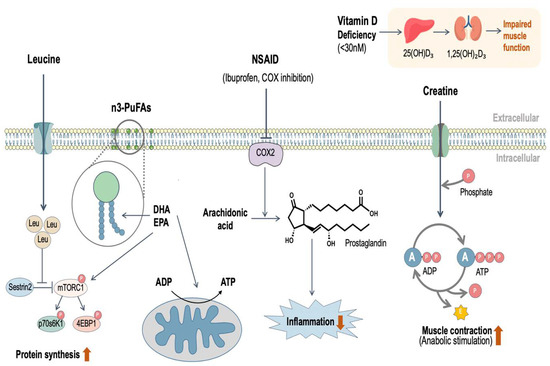 Schematic illustration of the mechanisms through which the nutritional supplements discussed in the present review may function to promote skeletal muscle adaptation. Leucine has been shown to independently activate the mammalian target of rapamycin (mTOR) signaling pathway through binding to Sestrin2, which increases protein synthesis. Omega-3 polyunsaturated fatty acids (n3-PUFA)—especially eicosapentaenoic acid (EPA) and docosahexaenoic acid (DHA)—serve as a component of phospholipids in muscle membranes, and not only enhance protein kinase activity, but also improve mitochondrial respiratory sensitivity to ADP. Vitamin D is metabolized to the active form, 1,25(OH)2D3, via the liver and kidney, and vitamin D deficiency is associated with impaired skeletal muscle function. Creatine has been shown to enhance resistance exercise performance, which stimulates anabolism through its integral role in the phosphocreatine energy system. Non-steroidal anti-inflammatory drugs (NSAID) reduce inflammation and oxidative stress, which may contribute to muscle loss in older adults. ADP, adenosine di-phosphate; ATP, adenosine tri-phosphate; A, adenosine; P, phosphate; E, energy; COX, cyclo-oxygenase; Leu, leucine; 4EBP1, eukaryotic initiation factor 4E binding protein 1.