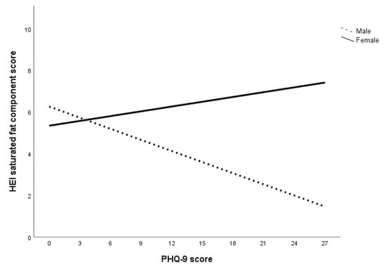 The relationship between depression and saturated fat consumption across sex. Note. Lower HEI saturated fat component score indicates higher consumption of saturated fat.