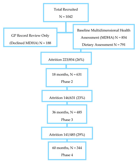 - Davies, K.A.; Kingston, L.R.J.; Hughes, J.M.; Hunt, S.A.H.; Barker, J.; Edwards, J.; Collerton, C.J.; Thomas, B.L.K. Improving Retention Of Very Old Participants In Longitudinal Research: Experiences From The Newcastle 85+ Study. PLoS ONE 2014, 9, e108370. [Google Scholar] [CrossRef] [PubMed]