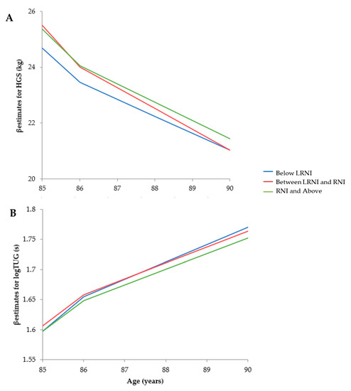 Mean hand grip strength (HGS) (A) and timed-up-and-go (TUG) (B) values across 5 years divided by selenium intakes: below lower reference nutrient intake (LRNI) (below 40 µg/d), LRNI-reference nutrient intake (RNI) (between 40 and 59 and 40 and 74 µg/d for women and men, respectively) and RNI and above (≥ 60 and ≥ 75 µg/d for women and men, respectively). Time intervals between each measurement were not consistent: 0, 1.5, 3 and 5 years.