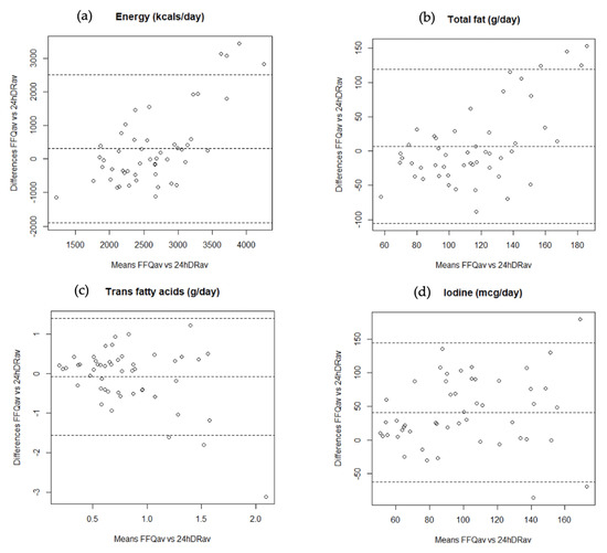 Bland-Altman plots showing the relationship between mean and differences in the daily intake of (a) energy; (b) total fat; (c) trans fatty acids, and (d) iodine estimated with the average of two FFQs and two 24hDRs.