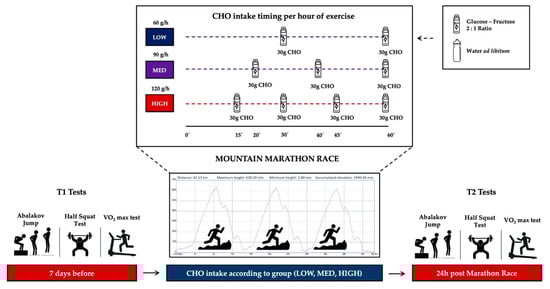 All participants ingested CHO during the race using the same gels made for this research at the University of Valladolid Physiology Laboratory (Soria) by an experienced pharmacist using a gel packaging machine. The gels contained 30 g of maltodextrin (glucose) and fructose (ratio 2:1) to increase exogenous CHO oxidation during exercise [39]. The athletes carried previously configured GPS alarms to notify them that they should intake CHO gels every 15, 20 and 30 min during the mountain marathon race, with runners needing to consume 1/4, 1/3 or 1/2 of the total g of CHO per hour according to their group (HIGH, MED, LOW, respectively) (Figure 1). Although athletes drank water ad libitum during the race, the participants ingested no food other than the gels. The athletes were instructed to extract the maximum content of the gels so that the residual amount was minimal. Likewise, all the athletes who finished the race confirmed through a questionnaire that all the gels had been taken at the time and in the manner previously indicated.