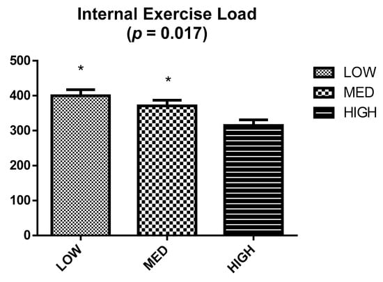 Figure 2 shows the TRIMP during the trail marathon, with a significant difference in TRIMP being evidenced between groups (p = 0.017). Specifically, a significant higher TRIMP was observed in LOW (399.8 ± 17.5) and MED (371.2 ± 16.2) compared to HIGH (314.8 ± 16.2).