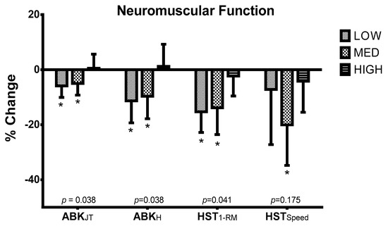 Figure 3 displays the percentage of change of ABK and HST between T1 and T2 in the three study groups. Significant differences were observed among groups in ABKJT (p = 0.038) and ABKH (p = 0.038). In this sense, there were significant improvements (p < 0.05) in ABKJT in the HIGH (0.53 ± 5.12%) compared to LOW (−5.90 ± 4.18%) and MED (−5.02 ± 4.22%). Likewise, there was a significant improvement (p < 0.05) in ABKH in the HIGH (1.19 ± 8.05%) regarding LOW (−11.33 ± 8.00%) and MED (−9.66 ± 8.19%). Figure 4 also shows significant percentage differences in HST1-RM among groups between T1 and T2 (p = 0.041). Specifically, a significant smaller decline was noted (p < 0.05) in HST1-RM in HIGH (−2.35 ± 7.23%) compared to LOW (15.30 ± 7.54%) and MED (−13.84 ± 9.74%) between T1 and T2, while HIGH (−4.19 ± 11.31%) evidenced a significant smaller decline (p < 0.05) in HSTSpeed compared to MED (−20.06 ± 14.75%) during the study.