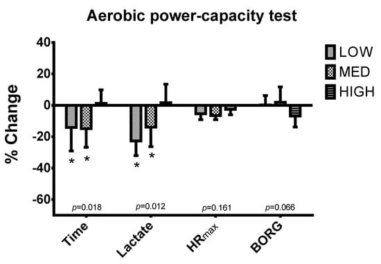 Figure 4 shows significant differences in percentage change of time in aerobic power-capacity test (p = 0.018) between T1 and T2. Specifically, HIGH (1.28 ± 8.55%) showed a significantly better change in time in aerobic power-capacity test compared to LOW (−14.09 ± 14.98%) and MED (−14.87 ± 11.86%) between T1 and T2 (p < 0.05). Likewise, HIGH (1.69 ± 11.78%) displayed a significantly higher increase in lactate (p = 0.012) compared to LOW (−22.69 ± 9.38%) and MED (−13.94 ± 12.41%). Furthermore, although the percentage change in HIGH showed a tendency towards better values in Borg compared to LOW and MED, these differences were not significant (p = 0.066).