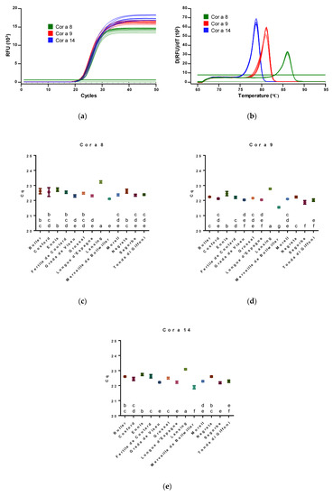 (a) Amplification curves and (b) melting peaks of different hazelnut varieties analyzed by real-time PCR using EvaGreen dye. Melting temperatures of 78.8 °C, 81.2 °C and 86.0 °C for PCR products from Cor a 14, Cor a 9 and Cor a 8, respectively. (c) Cor a 8, (d) Cor a 9 and (e) Cor a 14 cycles of quantification (Cq) values for the amplification of 20 ng of DNA from the different hazelnut varieties. Values with the same letter (a, b, c, d, e, f, g) do not differ significantly at p < 0.05.