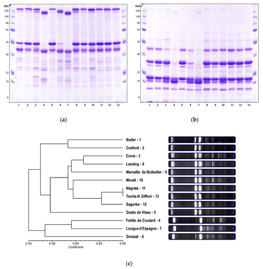 (a) Native and (b) reduced hazelnut protein electrophoretic profiles analyzed by SDS-PAGE using a 12% gel. Legend: lane 1, ‘Butler’; lane 2, ‘Cosford’; lane 3, ‘Ennis’; lane 4, ‘Fertile de Coutard’; lane 5, ‘Grada de Viseu’; lane 6, ‘Grossal’; lane 7, ‘Longue d’Espagne’; lane 8, ‘Lansing’; lane 9, ‘Merveille de Bollwiller’; lane 10, ‘Morell’; lane 11, ‘Negreta’; lane 12, ‘Segorbe’; lane 13, ‘Tonda di Giffoni’. Sizes (in kDa) of the protein molecular weight marker (SeeBlue™ Plus2 Pre-stained Protein Standard, Thermo Fisher Scientific, Massachusetts, USA) are shown on the left and right of the gel. (c) Dendrogram of genetic similarity among the 13 hazelnut varieties based on protein markers. The unweighted pair group method with arithmetic mean was calculated with the Jaccard’s similarity coefficient. The cophenetic correlation coefficient (r) for this matrix was 0.846.
