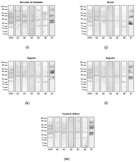 (a–m) Immunoblot of protein extracts from hazelnut varieties using individual sera from allergic patients. The secondary antibody was HRP-conjugated monoclonal anti-human IgE. Sizes (in kDa) of protein molecular weight markers (SeeBlue™ Plus2 Pre-stained Protein Standard, Thermo Fisher Scientific, Waltham, MA, USA) are shown on the left.
