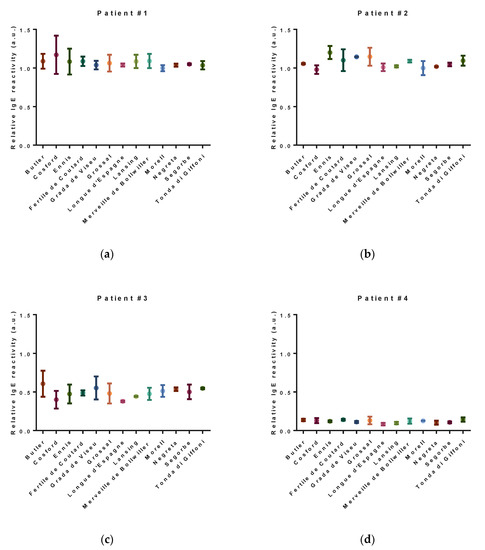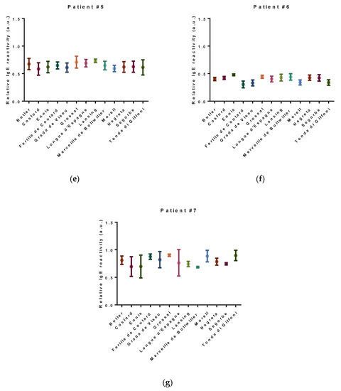 (a–g) Relative IgE-reactivity of the different hazelnut varieties under study using the sera of seven allergic individuals. No significant differences were detected (p < 0.05).