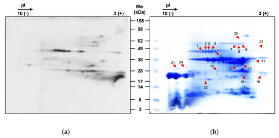 For 2-DE immunoblot, pooled sera of the hazelnut-allergic individuals were used. Negative controls were used both for 1-DE and 2-DE immunoblotting and consisted in the incubation using the sera of non-allergic individuals; no IgE reactivity was observed (Figure S1, Supplementary Material). Several combinations of hazelnut protein amounts and serum dilutions (in TBST) were tested to avoid clotting and to minimize the non-specific antibody response. The final conditions were 40 µg of protein per lane for 1-DE and 80 µg of protein for 2-DE with a serum dilution of 1:10. The results were visualized with chemiluminescent horseradish peroxidase (HRP) substrate (WesternBright™ ECL kit, Advansta Inc., San Jose, CA, USA) and X-ray films (LucentBlue X-ray film, Advansta Inc., San Jose, CA, USA). Densitometric analysis was conducted using reversible Ponceau staining as loading control [17]. Immunoblot analyses were performed for all the hazelnut varieties using the sera of hazelnut-allergic patients, individually (1-DE) or in pooled sera (2-DE), in two different experiments (each with two replicates).