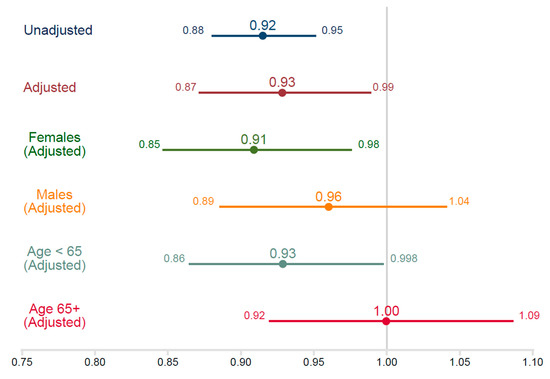 | High School Graduate | 0.93 | 0.80, 1.07 | 0.93 | 0.77, 1.13 | 0.94 | 0.73, 1.21 | 0.92 | 0.78, 1.09 | 0.79 | 0.55, 1.12 |