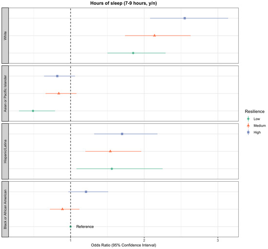 Estimated associations between self-reported psychological resilience and adequate sleep (recommended 7–9 h per night), adjusted for stressful life events (SLEs), sociodemographic information (age, race/ethnicity, and education), additional CVD-protective risk factors (BMI, diabetes, hypertension, and high cholesterol), and interaction between race/ethnicity and resilience. The odds ratio for each category is displayed along with bars representing 95% confidence intervals.