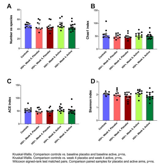 Alpha diversity is used to measure the richness and evenness of bacterial taxa within a community. Contrary to what is usually reported in many disease states, HIV-infected subjects displayed a similar richness of species (Figure 1A). At the genus level, we did not observe differences on richness indicators Chao1 and ACE (P = NS. for all comparisons, Figure 1B,C) between HIV-infected children and controls at baseline.