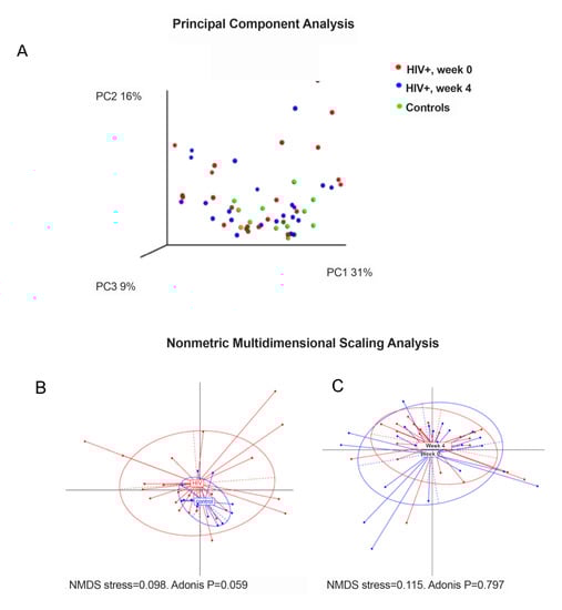 Beta diversity analysis based on weighted Unifrac distances. (A), Principal component analysis based on weighted Unifrac distances. HIV-infected children at baseline vs. controls, Adonis p = 0.042; HIV-infected children at week 4 vs. controls, p = 0.272; HIV-infected children at week 0 vs. week 4, p = 0.729. (B) Nonmetric multidimensional scaling analysis, HIV-infected children at baseline vs. controls and (C) HIV-infected children at baseline vs. week 4. NMDS, Nonmetric Multidimensional Scaling.