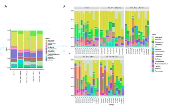 Relative abundance of top 15 more prevalent genus. Differences between the HIV-infected vs. the control groups could be appreciated, without clear differences related to the intervention. Figure 3 (A) shows the mean relative abundances of the top 15 most abundance genus in each group. Figure 3 (B) shows the individual relative abundances of each study subject at each timepoint.