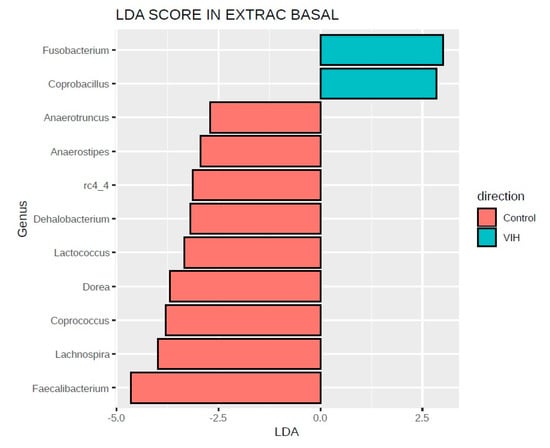 We used the linear discriminant analysis (LDA) effect size (LEfSe) algorithm [] to identify specific taxa biomarkers and reveal significant differences in bacterial abundances between the healthy controls with VIH patients and between the placebo arm and the interventional group.
