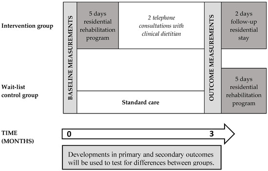 A randomized controlled trial was carried out from May 2019 to December 2019. Participants were randomized to either an intervention group participating in a multidisciplinary residential nutritional rehabilitation program from baseline to 3-month follow-up or a wait-list control group. For the primary objective, data were collected at baseline and 3-month follow-up (Figure 1). Further data collected for explorative objectives will be presented in future publications.