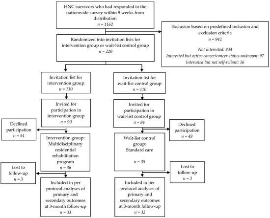 From baseline to the 3-month follow-up, the wait-list control group received no intervention other than standard care. In Denmark, HNC patients attend follow-up visits at oncological tertiary centers every 6 months for the first 2 years, and annually for the next 3 years. As needed and on referral, they can participate in the municipal rehabilitation services, which, as described, vary across municipalities. Hence, with participants being from all over the country, standard care could vary, and participants were not restricted from participating in other rehabilitation services during the trial. The wait-list control group was offered participation in the multidisciplinary residential nutritional rehabilitation program at the 3-month follow-up stage.