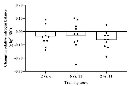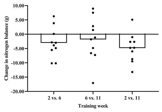 Figure 2. Data presented as mean change (g·kg−1 BM) in nitrogen balance between weeks. Individual data are also represented.