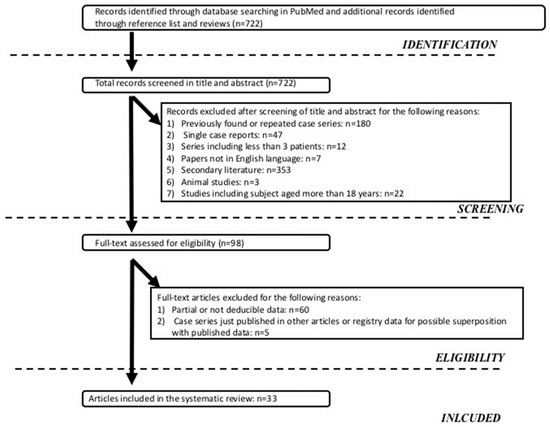 The systematic literature search identified 722 potentially relevant articles that matched the search criteria, as shown in Figure 1. After considering our inclusion and exclusion criteria, 33 articles (PN + AGIR, n = 19, and PN alone, n = 14) were selected.