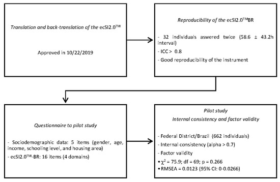This cross-sectional study, approved by the Ethics Committee of Santa Marta’s Institute of Teaching and Research, Federal District, Brazil (CAAE 24415819.2.0000.8101), was performed in three steps: (i) translation and back-translation of the original ecSI2.0TM to Brazilian Portuguese; (ii) evaluation of reproducibility; (iii) a pilot study to validate the questionnaire for the Brazilian adult population (internal consistency and factor validity).