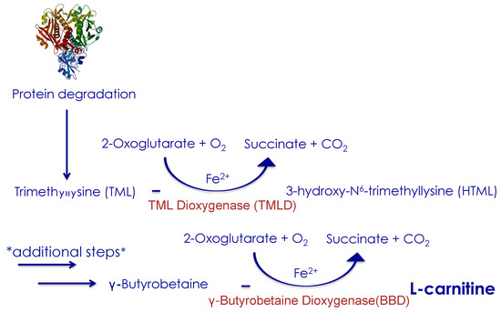- Strijbis, K.; Vaz, F.M.; Distel, B. Enzymology of the carnitine biosynthesis pathway. IUBMB Life 2010. [Google Scholar] [CrossRef]