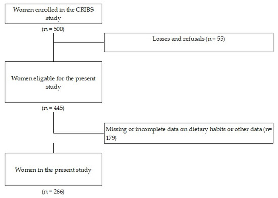 266 pregnant women from the CRIBS birth cohort were included in this study (Figure 2). The following maternal characteristics were examined in relation to the food and nutrient intake: age, education, household income, parity, smoking, pre-pregnancy BMI, employment status, working during pregnancy, physical activity level before and during pregnancy, and contraception. Demographic, socioeconomic, and lifestyle data pre- and during pregnancy were collected through two self-completed questionnaires. The medical data were collected from pregnancy booklets and hospital discharge letters, both for mothers and newborns (birth length and weight, delivery mode). Pre-pregnancy BMI was calculated from height and pre-pregnancy weight values, self reported by women, and then compared with measures taken during the first prenatal visit by a trained medical staff. BMI was analyzed as a continuous variable. Education was categorized into two groups: higher education (university and PhD degree) and primary or secondary education (high school or lower levels). Monthly income per family was divided into two categories: ≤10,000 HRK (Croatian currency-kuna) and ≥10,000 HRK, which approximately equals 1300.00 euros of monthly family income. Tobacco consumption was assessed through three questions: (1) whether the mother ever smoked; (2) whether she smoked during pregnancy; (3) and whether she stopped smoking when she found out she was pregnant. Physical activity level at work was divided into low (mostly office work) and high (lifting heavy objects, hard labor) level of work activity. The information about parity was dichotomized into nulliparous or having delivered one or more children previously.