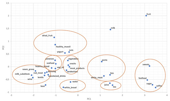 To reveal nutritional patterns in more detail, we conducted a principal component analysis (PCA) on cumulative frequencies of food items obtained from the nutritional questionnaire. The patterns are shown by means of the PCA loadings plot (Figure 3). PC1 appears to represent an abstraction of sugar and fat load in the sample with juice, alcoholic beverages, snacks, and meat giving a higher positive load on PC1, the rather balanced food without low loads on PC1, and fatty/heavier food showing a high negative load on PC1. PC2 appears to mirror clustering of food items in concordance to the main daily meals, with typical breakfast (muesli, yogurt, nuts, dried fruit) having a high load on PC2, heavy lunch food items (read meat, sauce, wine, potatoes, white bread) with almost no load on PC2, and basic food items (water, white bread), drinks, and coffee as light meal options with a negative load on PC2. The results indicate that women who eat more sweets, also eat more fast food and drink coffee. Similarly, women who eat red meat frequently also consume more sauces, gravies, and dressings and drink more wine and sweetened drinks—all food items that can be classified as unhealthy and not recommended during pregnancy. Two healthy groups are evident as well, encompassing typical food items of the Mediterranean diet (pasta, fish, and white meat in one group and dried fruit, muesli, yogurt, and nuts in the other group).