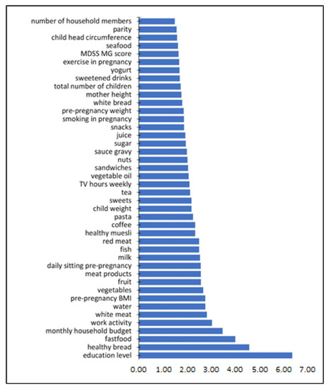 In order to extract variables which separate the two classes (island vs. mainland) in a non-linear manner, a machine learning approach was used. The results from the 1000 trained RF classifiers are reported as mean with a 95% confidence interval. With all of the variables (104) employed, the following classification metrics were obtained: accuracy 0.69 ± 0.01, kappa cohen score 0.35 ± 0.02; mcc 0.36 ± 0.02; auc score 0.74 ± 0.01; sensitivity 0.58 ± 0.02; specificity 0.78 ± 0.02. Judging by the values of kappa cohen score and the mcc, the classification can be categorized as “fair” [35]. The full variable importance table can be found in Appendix A Table A3. Variable importance was used as a tool for variable selection [39]. Variables with a mean importance of 1% and above were selected as relevant. There were 42 selected variables (Appendix A Table A4) which were employed in re-training. The re-training with re-sampling of 1000 classifiers after variable selection resulted in an insignificant improvement of the classification metrics. The results were: accuracy 0.69 ± 0.01, kappa cohen score 0.37 ± 0.02, mcc 0.38 ± 0.02, auc score 0.75 ± 0.01, sensitivity 0.59 ± 0.02, and specificity 0.77 ± 0.02. The 42 variable importances are plotted in a bar plot in Figure 4. Some dominant variables are the education level, followed by the cumulative frequencies in eating (healthy) bread and fast food, household budget, work activity, cumulative consumption of white meat, and hydration, as well as pre-pregnancy BMI.