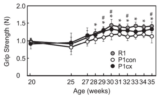 Effects of β-cryptoxanthin on the grip strength of SAMP1 mice. Grip strength of SAMR1 (R1), SAMP1-control (P1con), and SAMP1-CX (P1cx) groups from 20 to 35 weeks of age. Values are represented as mean ± standard deviation. n = 6–8 per group. * p < 0.05, statistical significance between the SAMR1 and SAMP1-control groups. # p < 0.05, statistical significance between the SAMP1-control and SAMP1-CX groups.