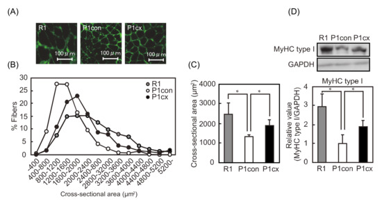 Soleus muscles were dissected from the mice, immediately frozen in chilled isopentane and liquid N2, and stored at −80 °C until use. The cross-sections (10-µm thick) of soleus muscle were cut in a cryostat (CM1850; Leica, Wetzlar, Germany) at −20 °C. The muscle sections were air-dried and then fixed with 10% formalin. The sections were washed with phosphate-buffered saline (PBS) and incubated with PBS containing 10% normal serum, followed by reaction with rabbit polyclonal anti-laminin antibody (Sigma-Aldrich, St. Louis, MO, USA) diluted with PBS containing 5% normal serum and 0.3% Triton X-100. The immunoreactive sections were incubated with goat anti-rabbit immunoglobulin G (IgG) (Alexa Fluor 488 conjugate) (Life Technologies, Grand Island, NY, USA) diluted with PBS containing 5% normal serum and 0.1% Triton X-100. Immunofluorescent images were obtained with a BIOREVO BZ-9000 microscope (Keyence, Osaka, Japan). The cross-sectional area (CSA) (µm2) of the muscle fibers was measured as described previously [25]. The mean fiber CSA was determined from more than 200 fibers per soleus muscle (n = 6–8 per group). The distribution of the CSA was plotted as frequency histograms.