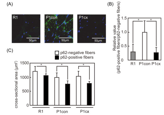 p62-positive fibers in the soleus muscle of β-cryptoxanthin-administered SAMP1 mice. (A) Immunofluorescent staining of p62 in the soleus muscle of the SAMR1 (R1), SAMP1-control (P1con), and SAMP1-CX (P1cx) groups. Scale bar: 50 μm. (B) Relative value of the ratio of p62-positive fibers to p62-negative fibers in the SAMP1-control group. Values are represented as mean ± standard deviation. n = 5–8 per group. * p < 0.05, statistical significance compared with the SAMP1-control group. (C) CSA of p62-positive fibers (white bar) and p62-negative fibers (black bar). Values are represented as mean ± standard deviation. n = 6–8 per group. * p < 0.05, statistical significance compared with the CSA of p62-negative fibers.