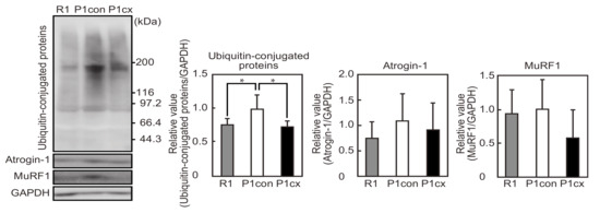 Effects of β-cryptoxanthin on ubiquitin-conjugated proteins and E3 ubiquitin ligase expression in the soleus muscle of SAMP1 mice. Western blot analyses of ubiquitin-conjugated proteins, atrogin-1, and MuRF-1 expression in the SAMR1 (R1), SAMP1-control (P1con), and SAMP1-CX (P1cx) groups. Ubiquitin-conjugated proteins, atrogin-1, and MuRF-1 expressions were normalized to GAPDH expression. Values are represented as mean ± standard deviation. n = 5 per group. * p < 0.05, statistical significance compared with the SAMP1-control group.