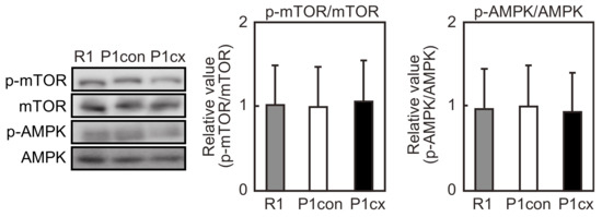 Effects of β-cryptoxanthin on mTOR and AMPK activation in the soleus muscle of SAMP1 mice. Western blot analyses of the expressions of mTOR, AMPK, and their phosphorylated proteins in the SAMR1 (R1), SAMP1-control (P1con), and SAMP1-CX (P1cx) groups. Values are represented as mean ± standard deviation. n = 5 per group. * p < 0.05, statistical significance compared with the SAMP1-control group.