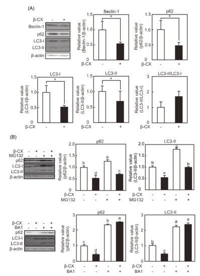Effects of β-cryptoxanthin and bafilomycin A1 on p62 and LC3-II expression in C2C12 myotubes. (A) Western blot analyses of autophagy-related factor expression in β-cryptoxanthin (β-CX)-stimulated C2C12 myotubes. Autophagy-related factor expressions were normalized to β-actin expression. Values are represented as mean ± standard deviation. n = 3. Each image is representative of at least three independent experiments. * p < 0.05, statistical significance. (B) Western blot analyses of p62 and LC3-II expression in β-cryptoxanthin (β-CX)-stimulated C2C12 myotubes in the presence of bafilomycin A1 (BA1) or MG132. p62 and LC3-II expressions were normalized to β-actin expression. Values are represented as mean ± standard deviation. n = 3. Each image is representative of at least three independent experiments. Statistical significance (p < 0.05) among groups is denoted by different letters.
